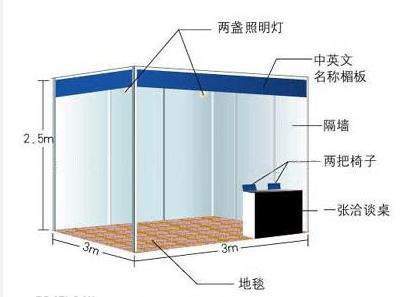 ■标准展位费用包括:展出场地、2.5m高壁板、楣牌制作、9平方米地毯、洽谈桌一张、椅子二把、10A/220V 单相插座一个,射灯二支。 ■空场地不带任何展架及设施,参展商可自行安排特殊装修工作或委托组织单位推荐的搭建公司。 标准展台示意图: 特装展台示意图: